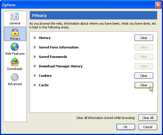 - Click on the Clear Disk Cache button. Click the OK button in the dialog window that appears to confirm the deletion of your disk cache. (On the Windows platform, after deleting your disk cache, also click the Clear Memory Cache button.).